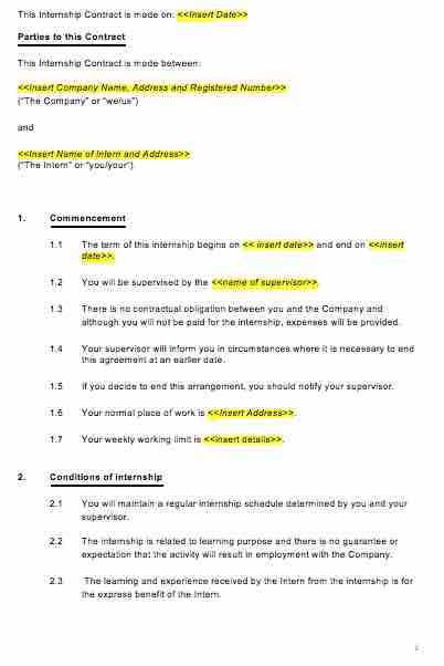 This Internship Agreement contains the following clauses: