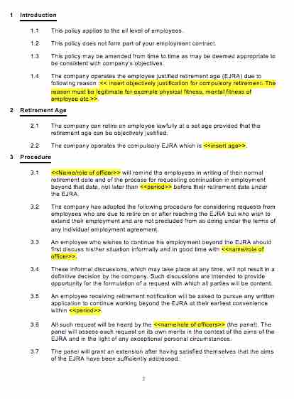 For a Retirement Policy with No Compulsory Retirement Age please see Retirement Policy (No Compulsory Retirement Age).